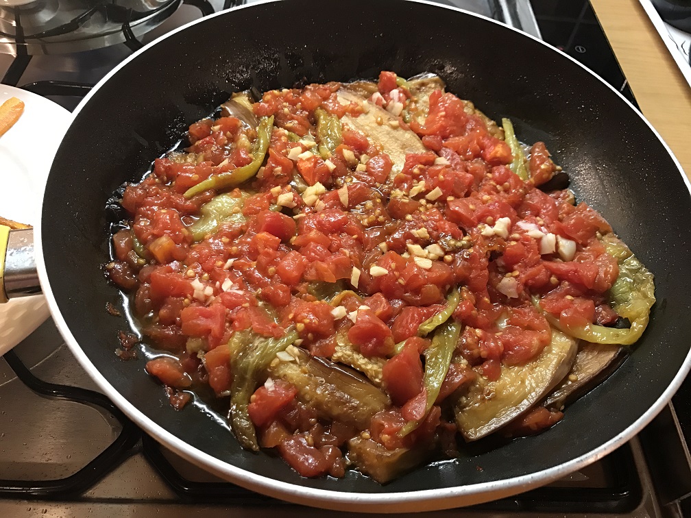 - Kızarttığınız patlıcan ve biberler tavaya dizin.